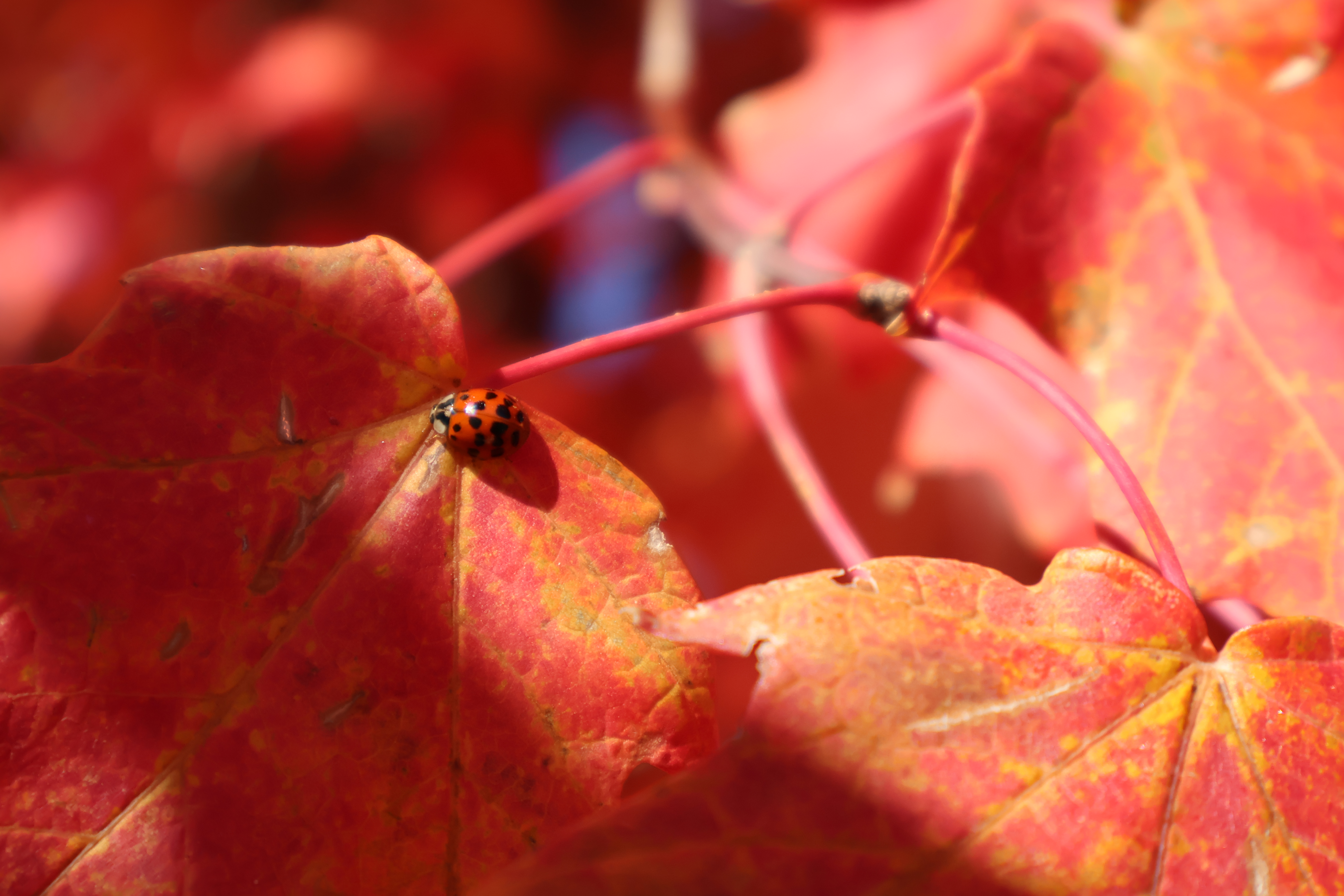 I had parked under a row of maple trees adorned gloriously in shimmering red leaves. After having visited the park I nearly snickered to myself as I concluded that the most fabulous fall foliage ended up there in the parking lot! So I decided to take my time under the canopy of the nearest maple tree. I took note of how the light shown through and how the wind gently rustled the leaves. And then I spotted something entirely by chance—the smallest of little beetles perched in the sunlight on a leaf. It quickly gained my full attention. I watched it intently and I moved about to attempt to capture a good photo of it. I felt amused, amazed and awed by it and the moment I found myself in.