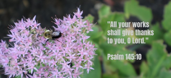 As I read Psalm 145 I find myself wondering too about how the bumblebees thank God. I can honestly say that I really had not considered that question before now. Yet, the psalmist claims that all of God’s works shall give thanks so that must include the bumblebees. Maybe it’s something expressed by their buzzing. Maybe it’s how they just be as bees without worrying about anything. Maybe it’s in how they delight God in a way not so different in how they delight me.